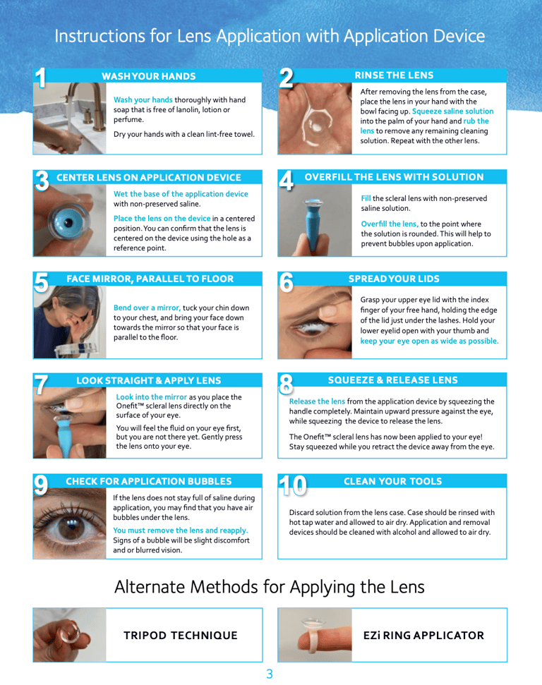 While Picasso-esque perfection is simply in her nature, Elsa took this piece very seriously and personally, as she is a Onefit scleral lens wearer herself. She analyzed every aspect of the guide, comparing it to her daily application and removal experience. Elsa not only provided invaluable insights every step of the way, but also took the initiative to take high quality pictures of herself handling the lenses, filling in many gaps where our imagery was not ideal.